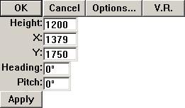 The current position and heading of the camera are shown in the top-left corner of the screen. The height is the height of the camera off the floor. The pitch is the angle the camera is "looking" relative to the horizontal. Increasing the pitch looks "up" towards the ceiling (a pitch of 90 would be looking straight up). A negative putch looks "down" towards the floor (a pitch of -90 would be looking straight down). The pitch can be any value between -90 and 90.