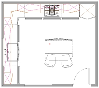 To change where the light is shining to on your design, hold down the right mouse button on the light source and drag to the desired location. In the above example the light is shinging from the light source towards the side of the cabinets. See "Spot destination", "Spot destination height" and "Examples" below.